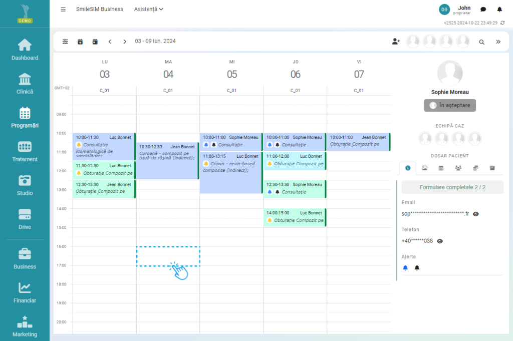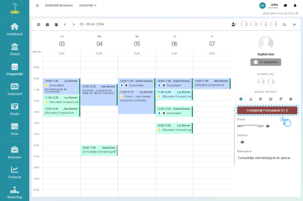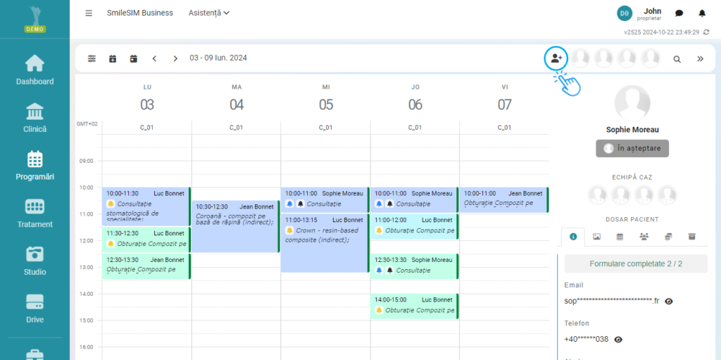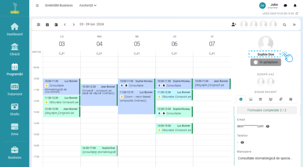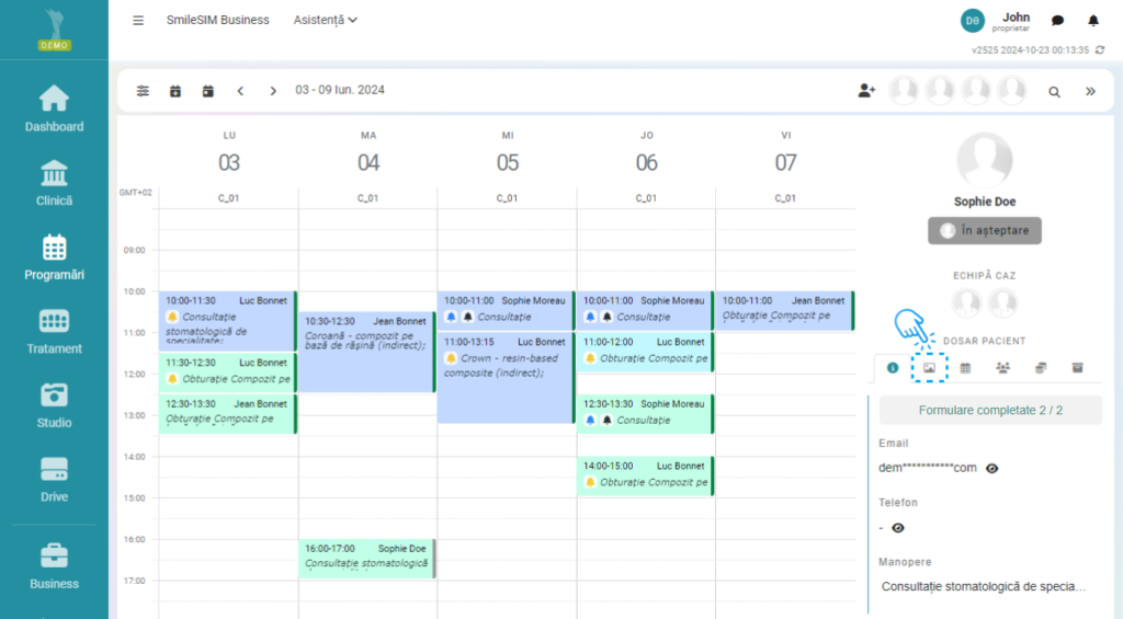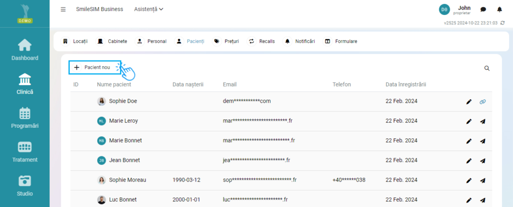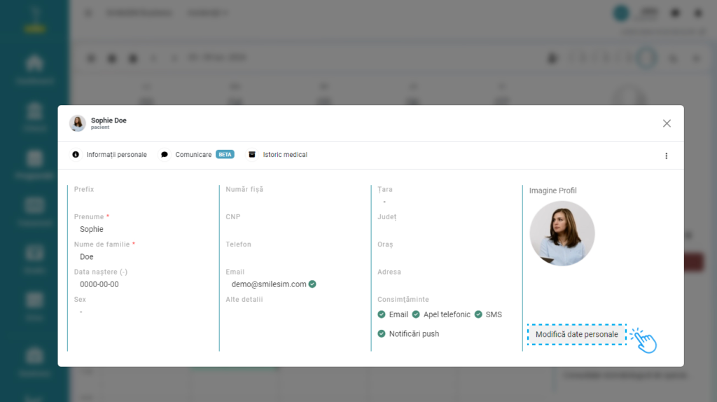 Modificarea sau adăugarea altor detalii se pot face prin click pe numele pacientului, in modulul „Clinică”>Pacienti, sau click pe numele pacientului in modulul „Programări”, dreapta ecranului.