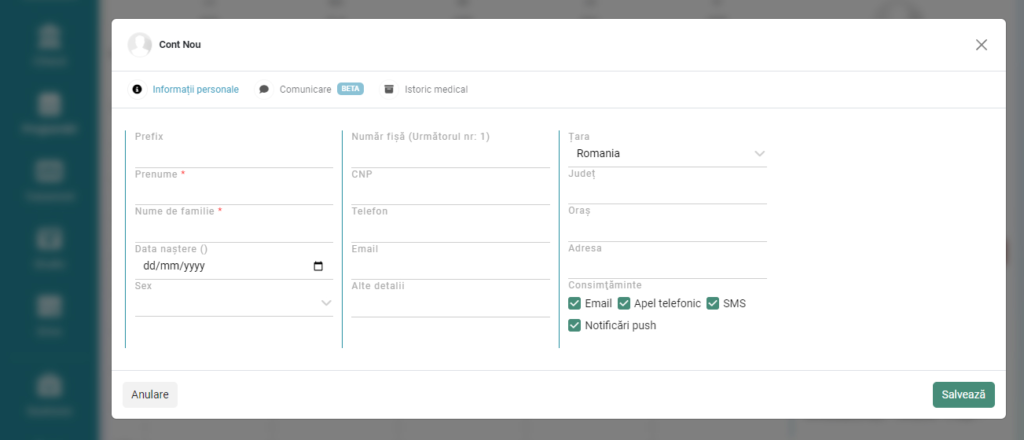 Dacă este prima interacțiune cu pacientul și aveți puține informații, este suficient să completați doar numele si prenumele pacientului. Datele suplimentare pot fi adăugate ulterior. După ce introduceți numele, apăsați pe „Salvați”.