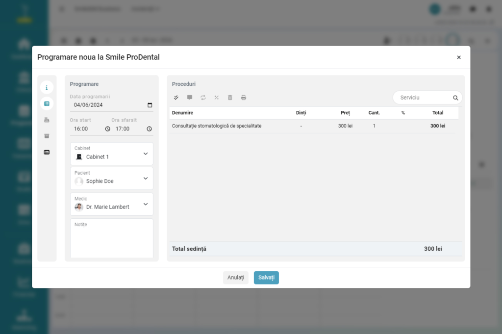 - După ce pacientul finalizează consultația in cabinet, dublu click pe programarea din calendar și asigurați-vă că ați adăugat procedurile/manoperele efectuate.