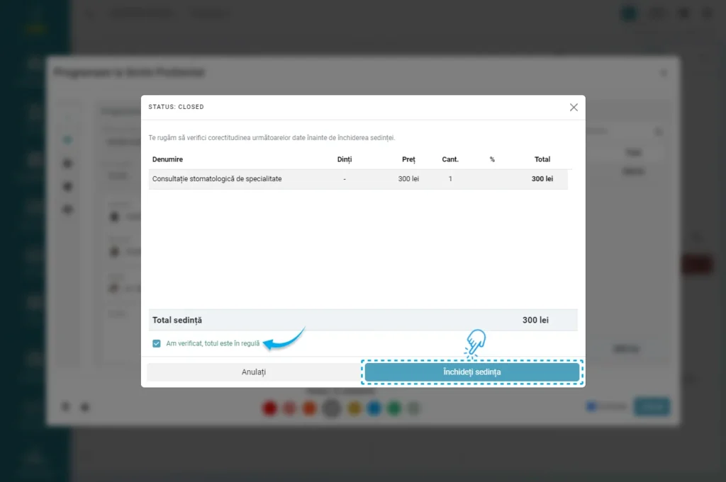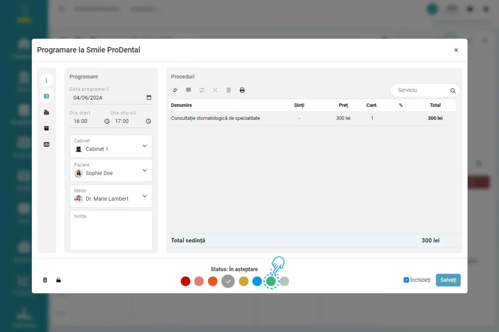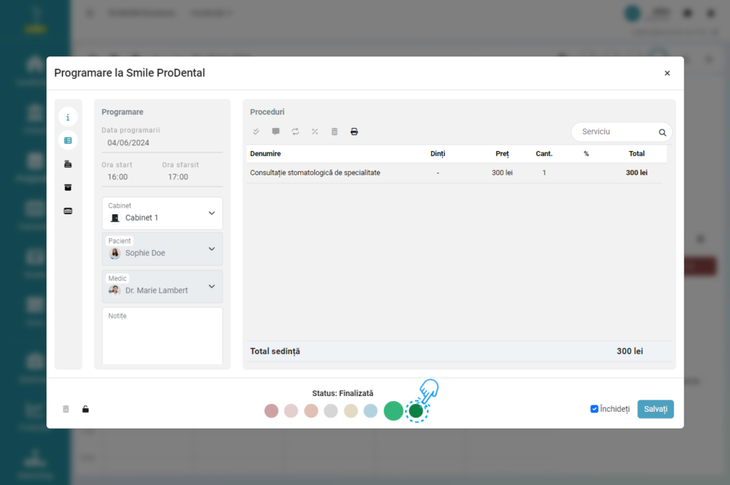 - Schimbați statusul programării în „Finalizată” (bulina de culoare verde).