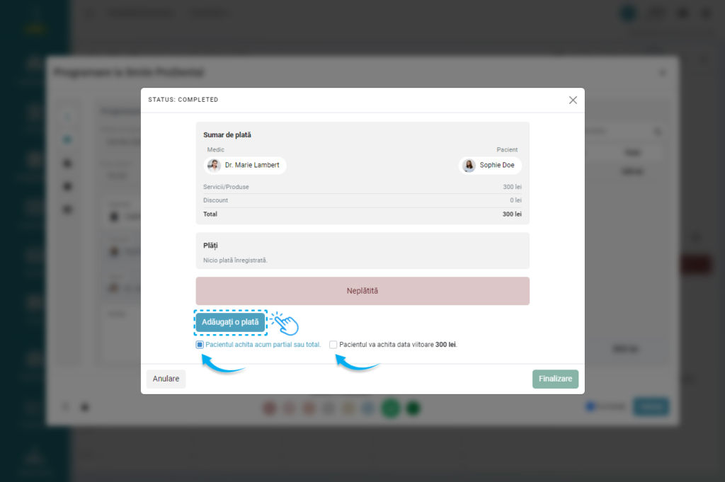 - Schimbați statusul programării în „Completă” (bulina de culoare verde închis) și înregistrați detaliile plății.