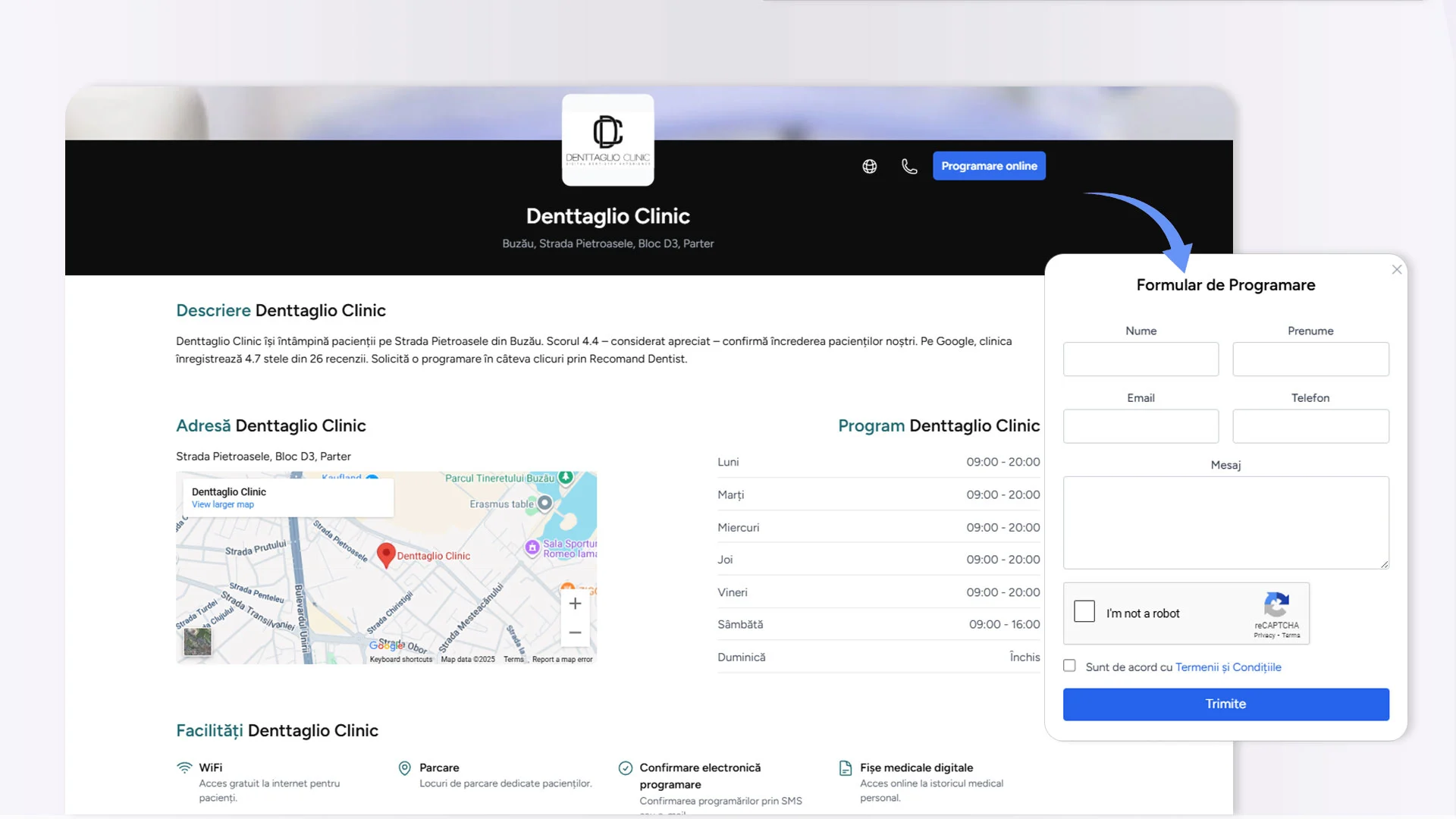 - posibilitatea de a trimite cereri de programare online.