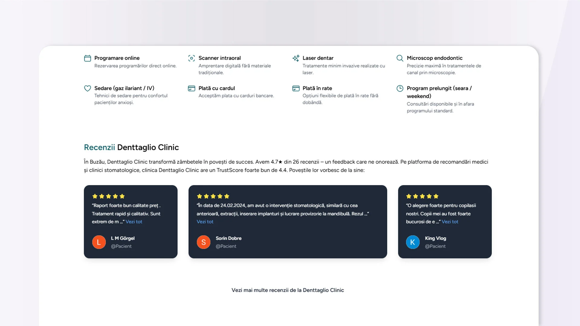 Platforma pune accent pe modul real în care pacienții își aleg medicul: pe baza recomandărilor și a experiențelor altor pacienți. Într-un context în care prezența online influențează direct decizia, RecomandDentist.ro oferă clinicilor șansa de a atrage pacienți noi și de a-și consolida reputația.