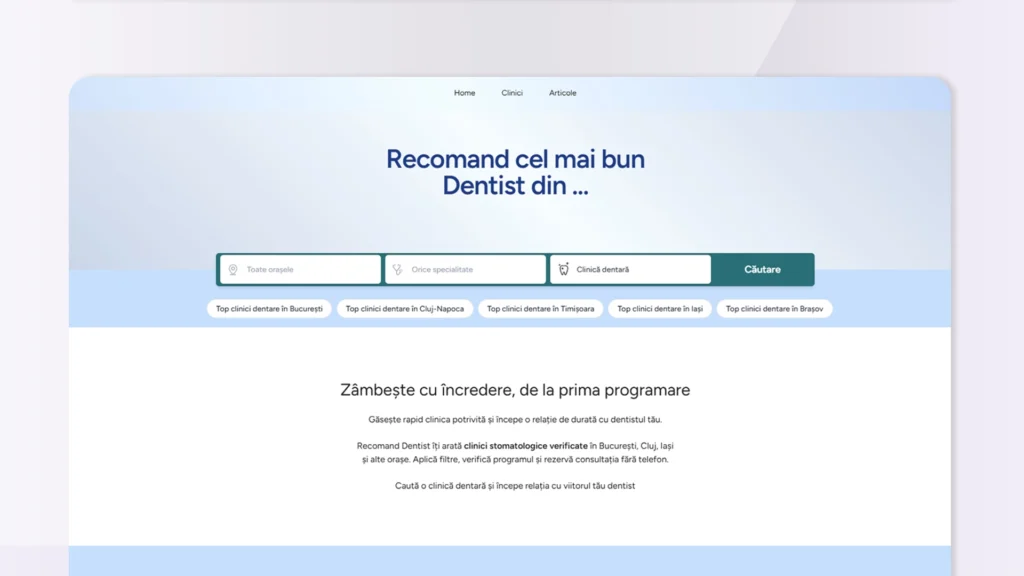 Suntem încântați să anunțăm o noutate importantă în portofoliul nostru de soluții digitale: platforma RecomandDentist.ro, un punct de vizibilitate esențial pentru clinicile stomatologice.