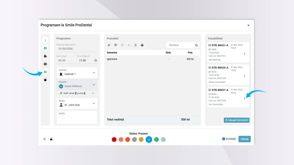 Am introdus posibilitatea de a înregistra trasabilitatea instrumentarului utilizat la vizita curentă. Pentru fiecare programare, puteți adăuga direct codurile unice de pe pungile de sterilizare și detaliile etichetelor în fișa digitală a pacientului. Această funcționalitate asigură o evidență clară și ușor de accesat a instrumentelor sterilizate folosite în timpul actului medical.