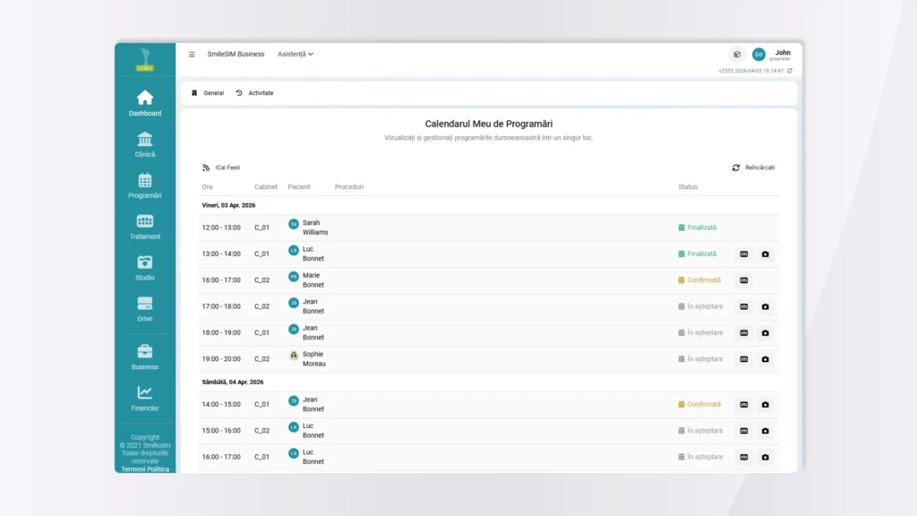 Fiecare membru al echipei are acum o vedere generală, în format listă, a programărilor proprii care urmează. Din aceeași zonă există acces rapid la istoricul medical al pacientului și la planul de tratament. Acest lucru oferă orientare mai bună în ziua de lucru și acces rapid la contextul clinic.