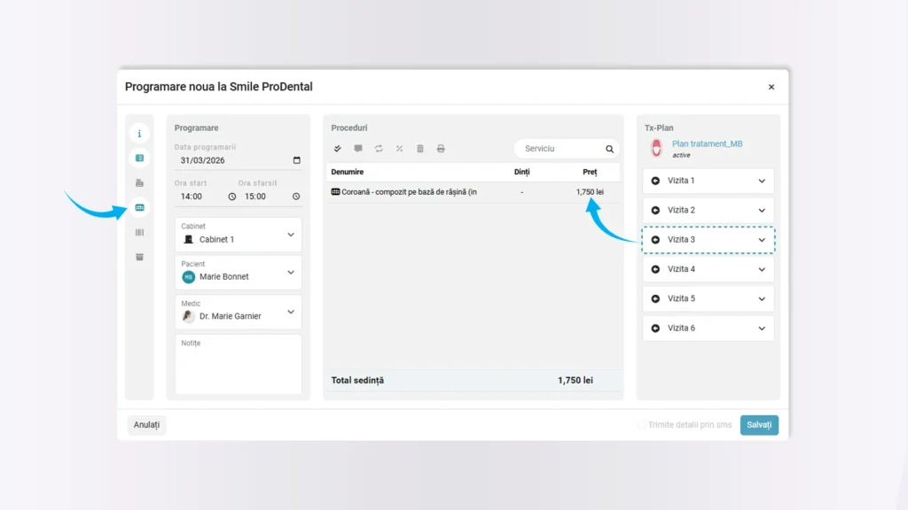 Am îmbunătățit legătura dintre planul de tratament și programări, astfel încât recepția să știe ce urmează la următoarea vizită. În baza planului de tratament activ, procedurile pot fi adăugate la programarea curentă cu un singur click, în ordinea vizitelor planificate. Pe măsură ce vizitele au loc, procedurile sunt marcate în plan ca fiind efectuate.